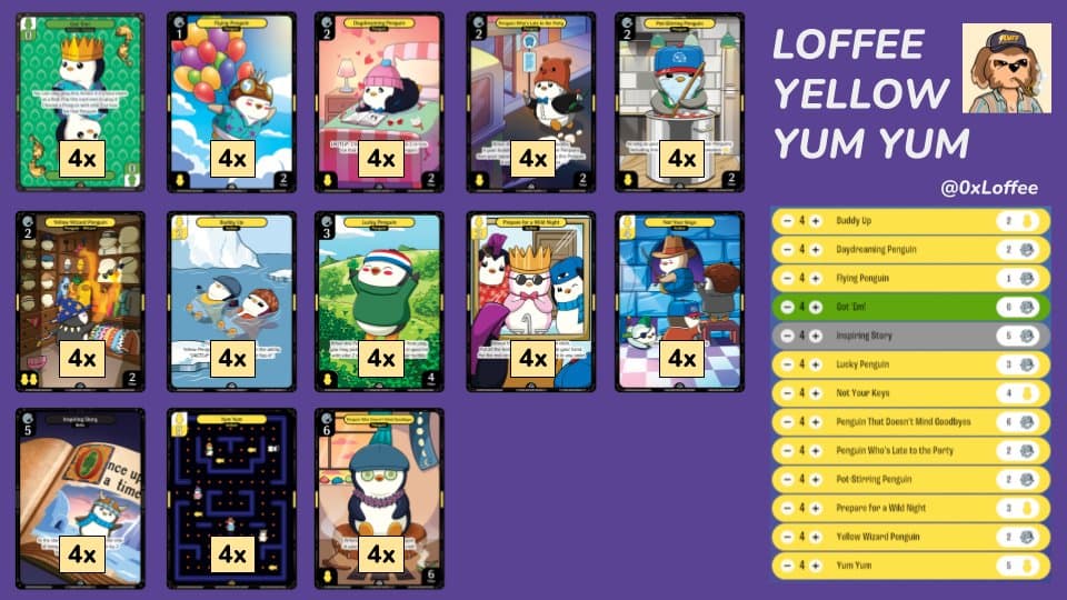 The deck revolves around Yum Yum, which ices all penguins as yellow for five Yellow Pudge, providing an efficient way to reset the board. Key supporting cards include: