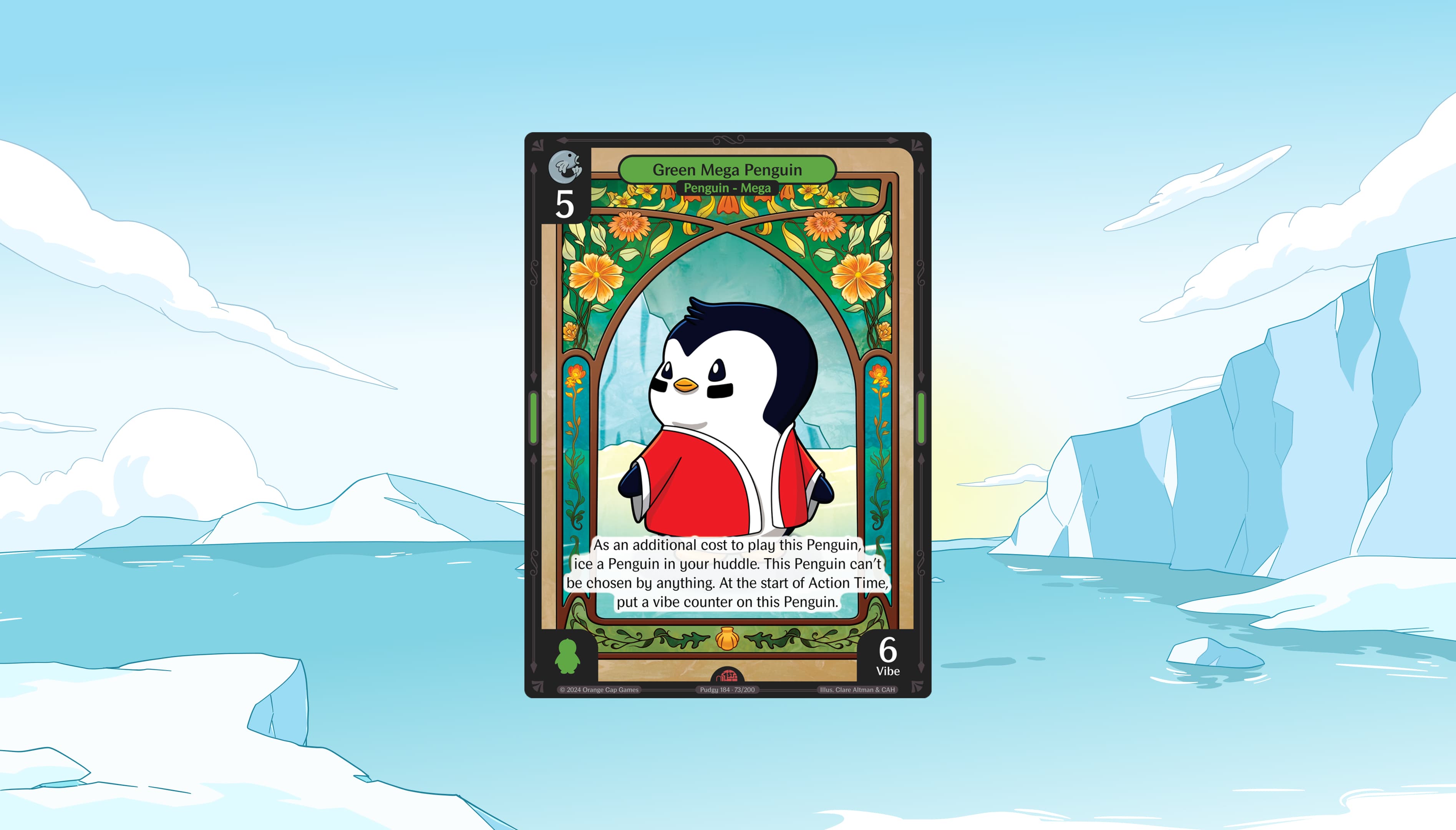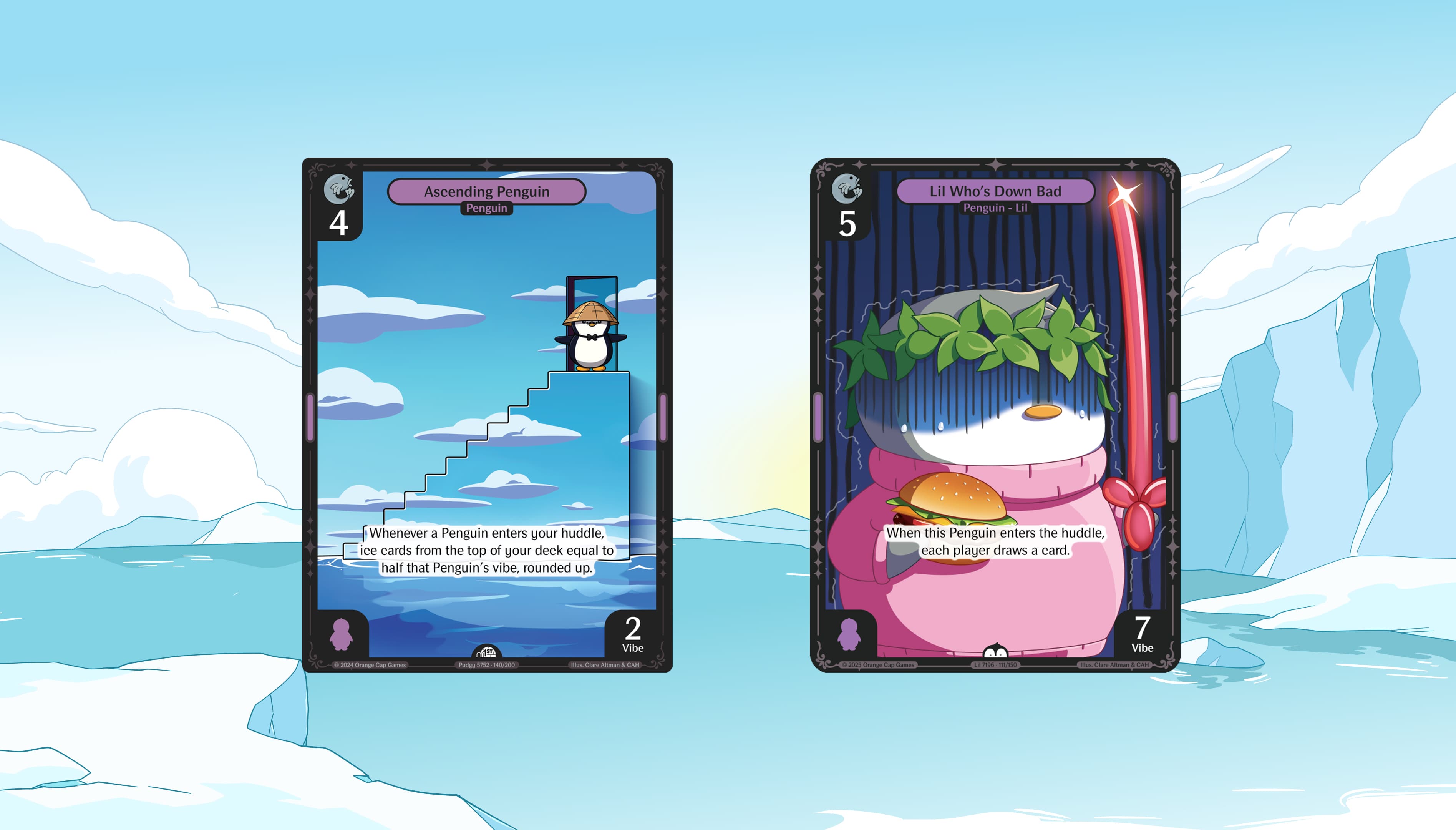 Ascending Penguin — Whenever a Character enters your huddle, ice cards from the top of your deck equal to half that Character's vibe, rounded up.