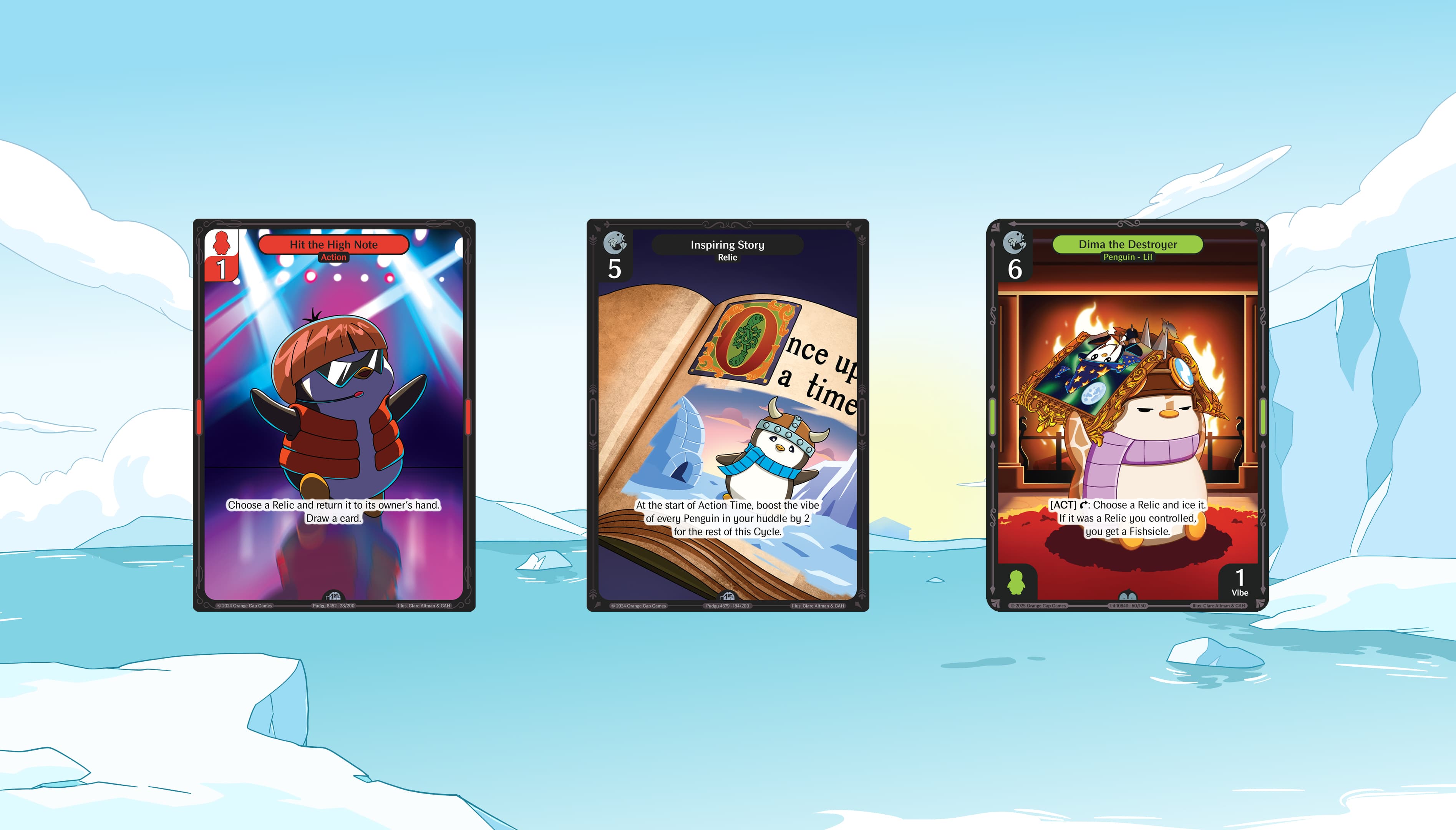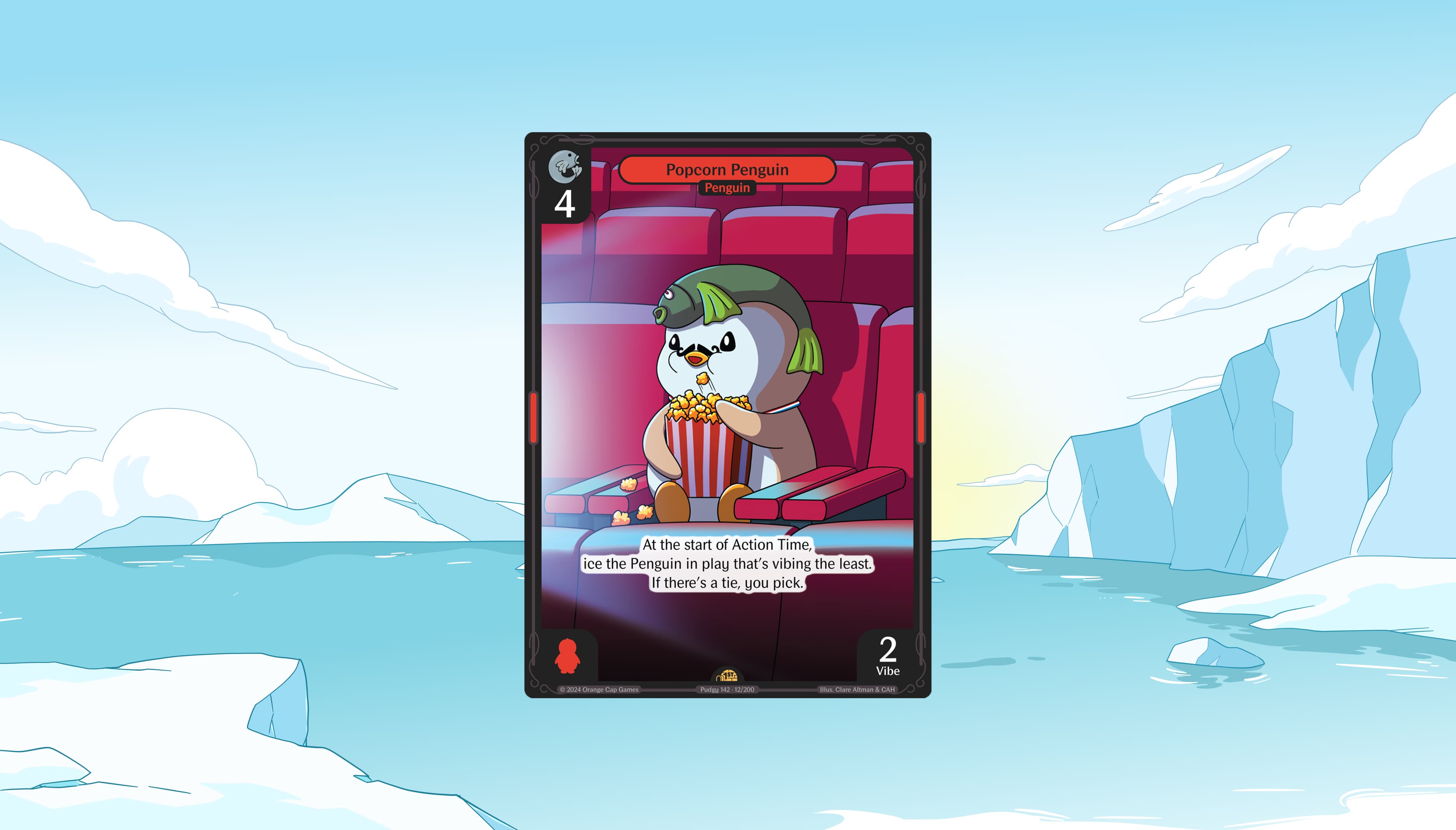 Popcorn Penguin (controlled by Player A, Baron) — At the start of Action Time, ice the Character in play that's vibing the least. If there's a tie, you pick.